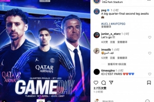 赛前,巴黎官方社媒发布了此役精心制作的海报:其中主帅恩里克、马尔基尼奥斯和阿什拉夫三人出镜,并配文:万众瞩目的1/4决赛次回合大战一触即发。
